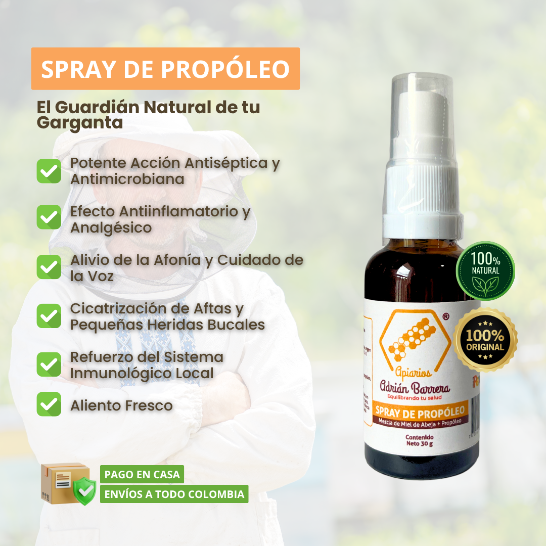 Es un producto 100 natural ideal para cuidar la salud de la garganta y fortalecer el sistema inmune Tenemos dos versiones Spray de Prop leo puro Recomendado para adultos Spray de Prop leo con miel M s suave y agradable para ni os Beneficios principales Alivia dolor de garganta y afon as Combate bacterias y virus en la boca Refresca el aliento y protege enc as Refuerza las defensas de forma natural Ideal para usar a diario o en temporadas de gripe Presentaci n Frasco spray de 30 ml